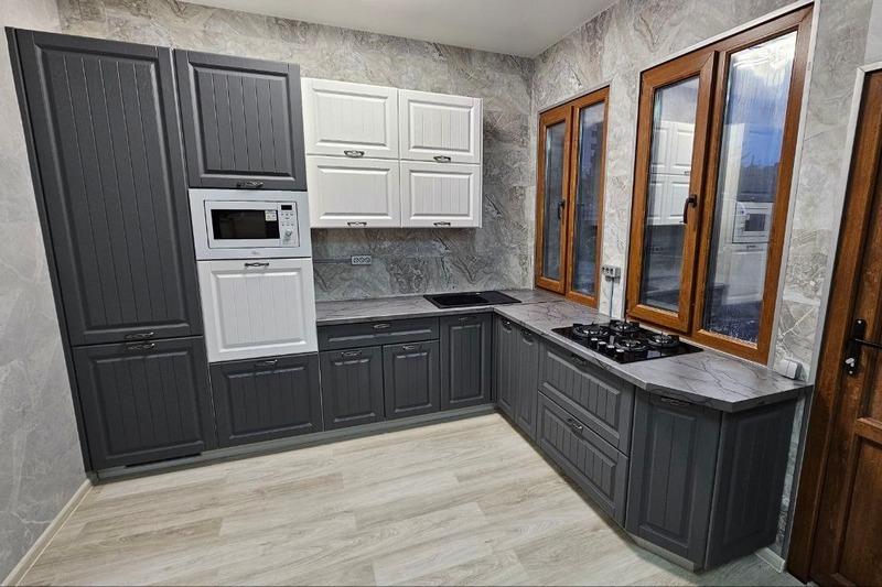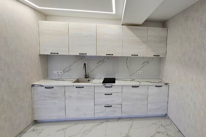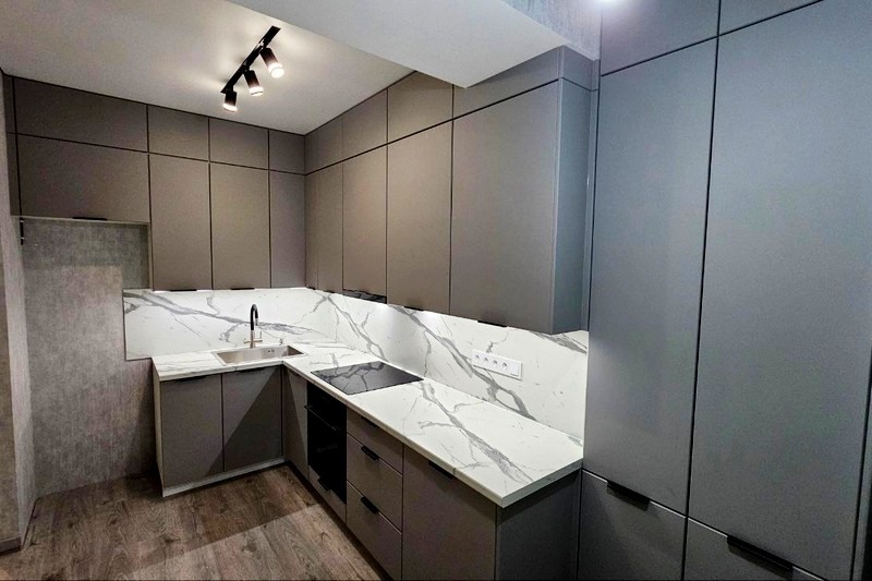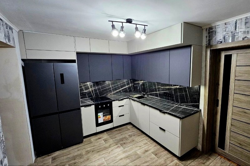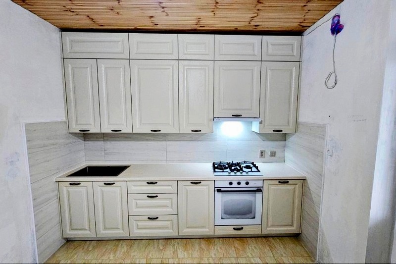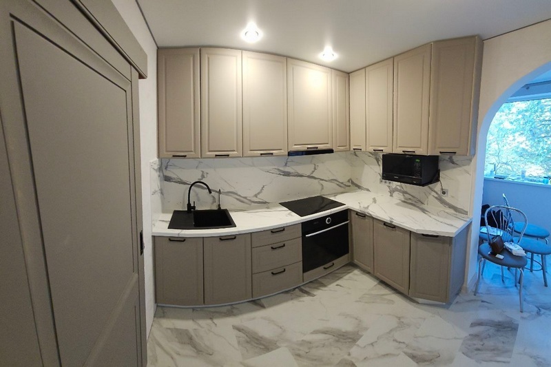 Мы работаем как с фабричными модульными кухнями (наборка из стандартных модулей), так и по индивидуальным размерам (с сохранением фабричного качества и невысокой цены).